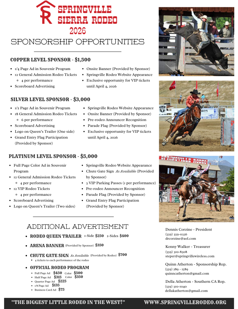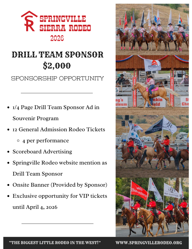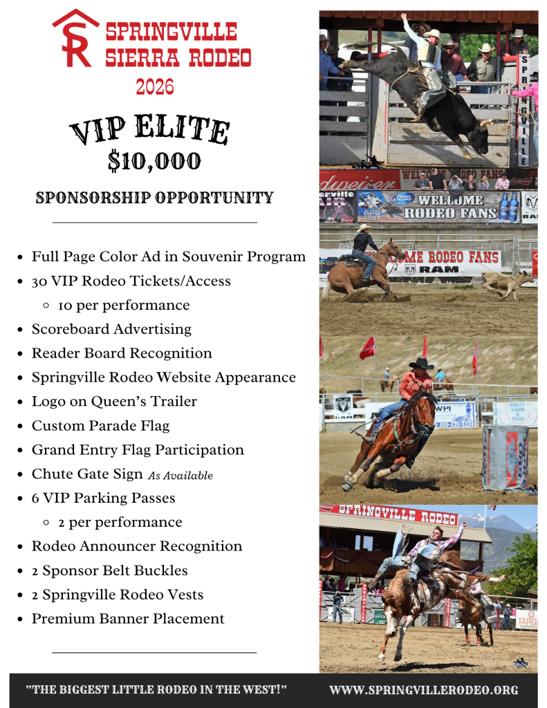 Thank you for your interest in the sponsorship program for the Biggest Little Rodeo in the west. The Biggest Little Rodeo has been a part of Springville for over 70 years. In addition to the Rodeo, Springville Sierra Rodeo Association hosts the Rodeo Parade and the Rodeo Dance. The history and tradition of these activities help define Springville and family entertainment for our community and surrounding areas. Sponsors play a major part in assisting with the preservation of the history of our community for future generations.